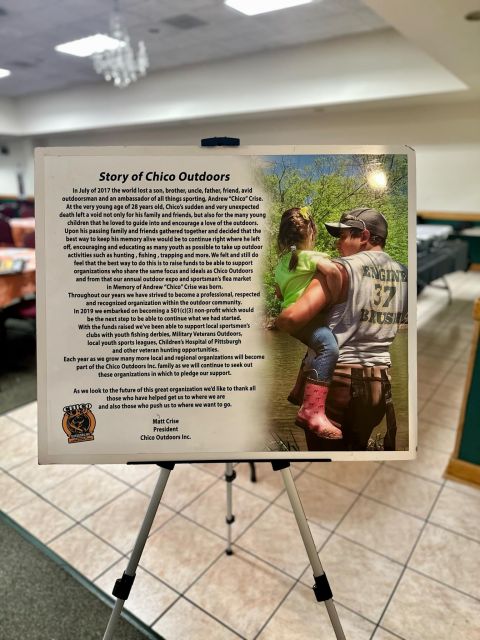 Chico Outdoors, Inc. is a nonprofit organization founded in memory of Andrew "Chico" Crise, who passed away at a young age due to an undiagnosed heart condition. Chico Outdoors seeks to promote outdoor recreational activities such as hunting, fishing and trapping! Since its founding in 2018, Chico Outdoors has grown into an organization that not only hosts an annual Outdoor Expo in April of each year, but one that promotes outdoorsmanship yearround by sponsoring and donating to youth organizations, youth outdoor events and veteran organizations associated with the outdoors. The 2025 Outdoor Expo will include speakers and demonstrations on various topics, live music, raffles, Chinese auction, door prizes, kid's games, a kid's live fishing pond and so much more. Vendors will include firearm and archery dealers fishing supplies, hunting supplies, taxidermists, outdoor vendors, equipment and boat dealers and more! Food and beverages of all kinds will also be available!